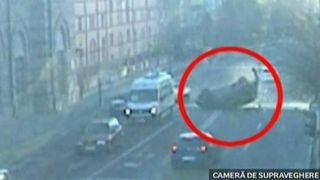 Impactul este atat de violent, incat masina cea neagra se rostogoleste ca-n filme. O roata si o portiera se imprastie pe asfalt, chiar in fata unui pieton ingrozit.
