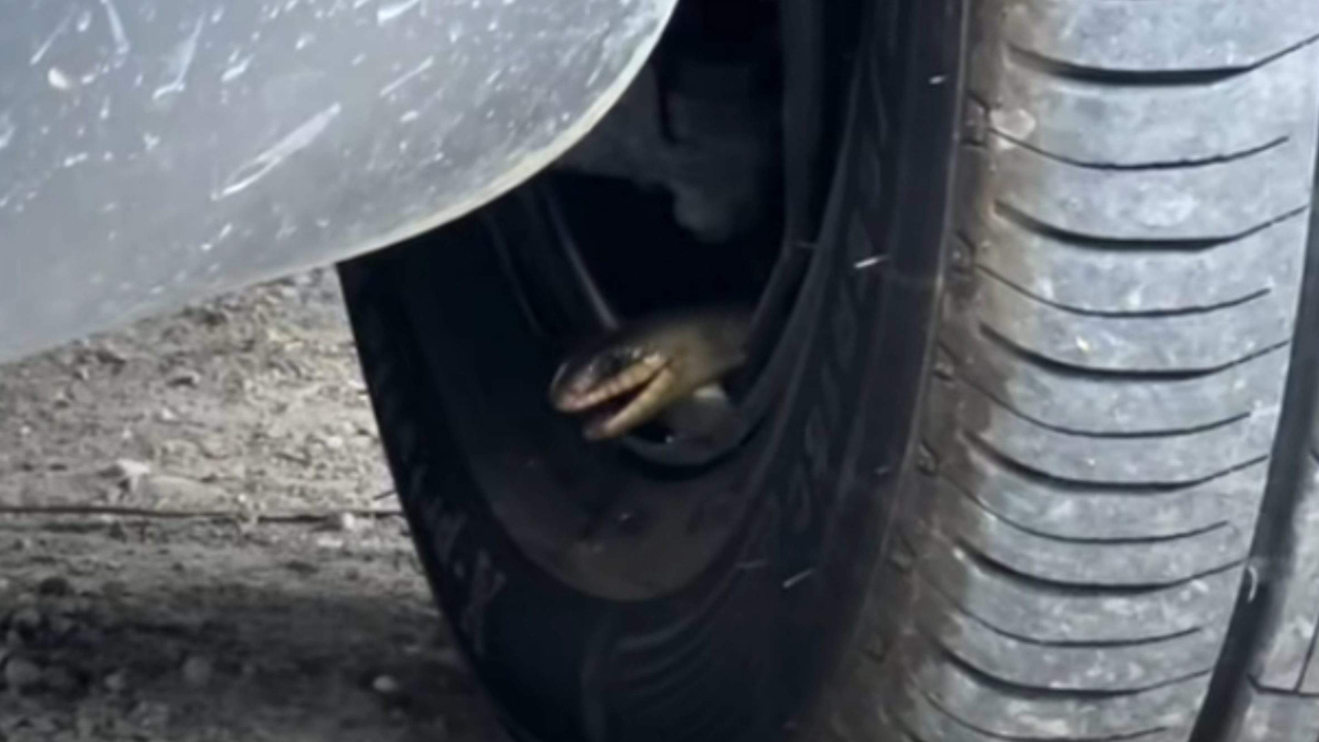 Incidentul s-a petrecut într-o zonă rezidențială, iar imaginile au stârnit rapid reacții în mediul online. Potrivit bărbatului, totul a început când se pregătea să plece cu mașina și a observat ceva ciudat în zona roții din față. La o privire mai atentă, a realizat că printre striațiile anvelopei se zărea un corp subțire și solzos. A fost nevoie de doar câteva secunde pentru a înțelege că era vorba despre un șarpe blocat între cauciuc și jantă.