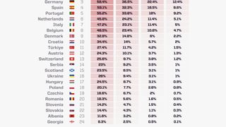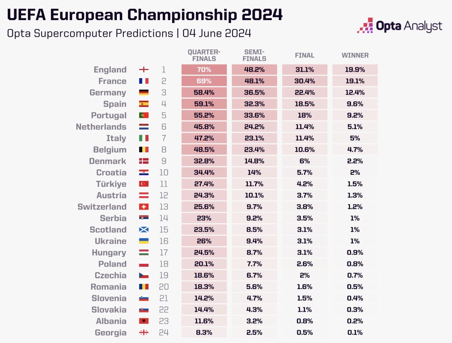 Potrivit Opta Supercomputer, România este una dintre cele cinci echipe calificate la Euro 2024, alături de Slovenia, Slovacia, Albania și Georgia, care are șanse de doar 0,5% sau mai puțin de a câștiga turneul din Germania.