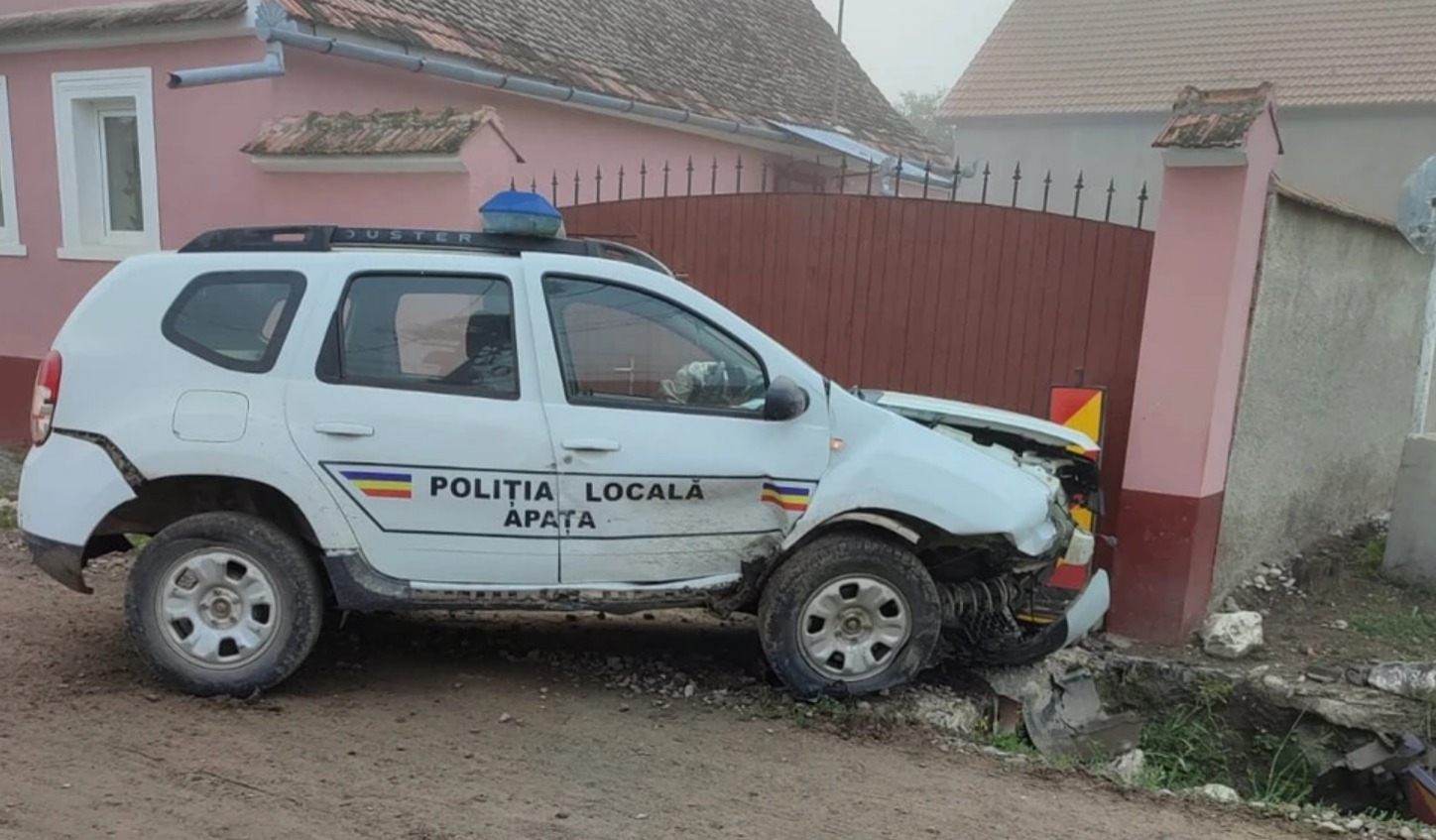Minorul a furat mașina Poliției Locale Apața, iar la scurt timp a intrat în colțul gardului unei curți.