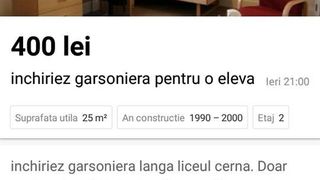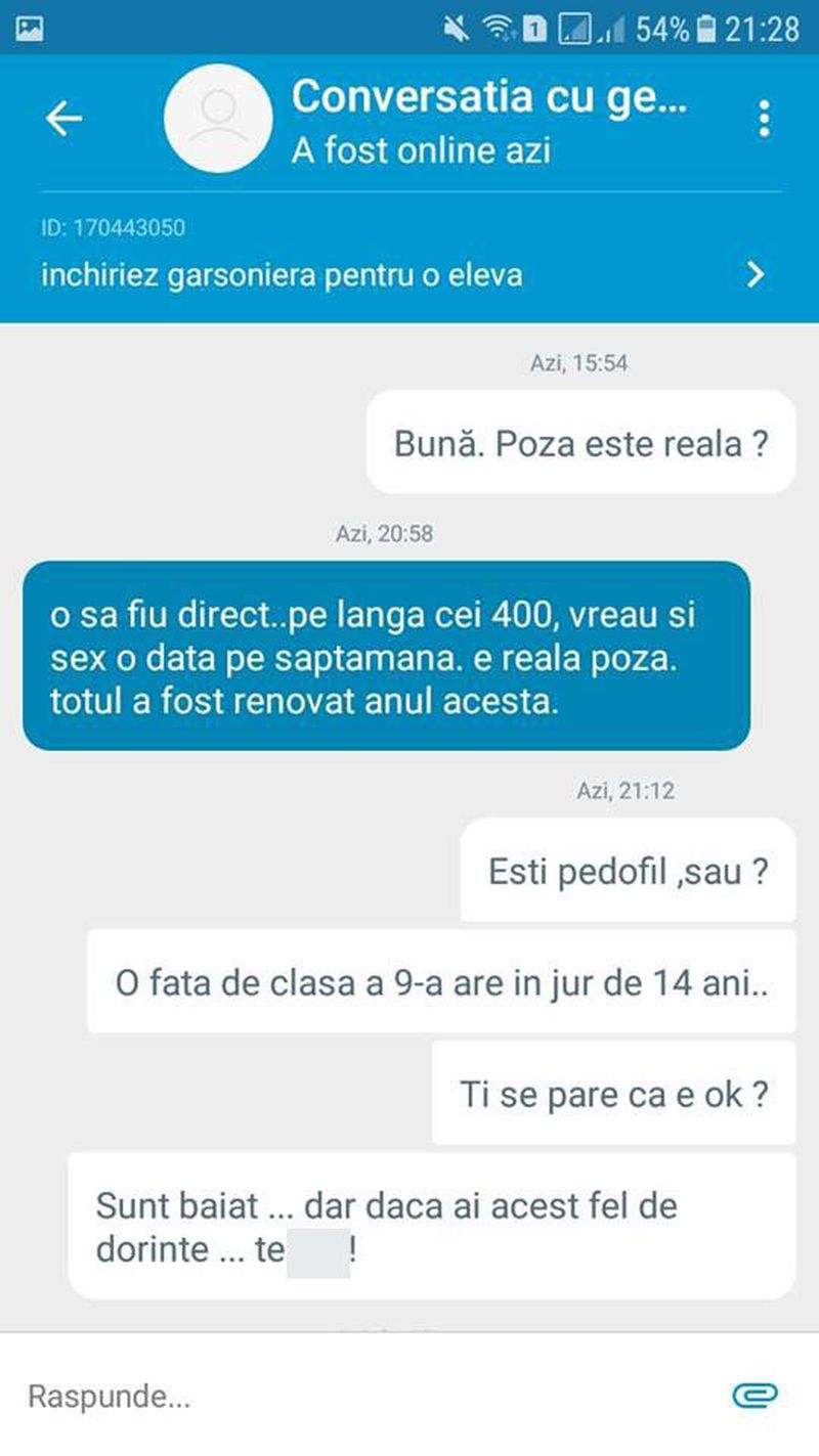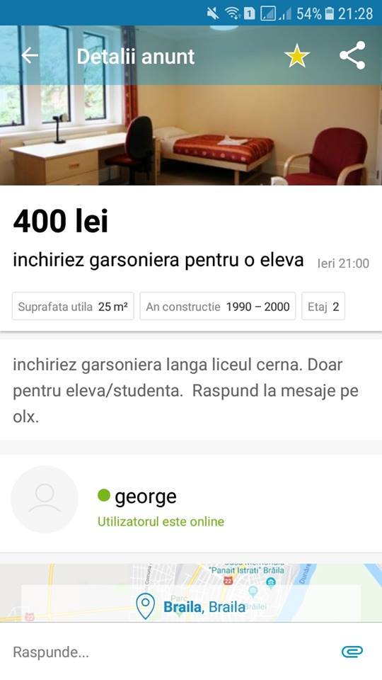 "400 lei. Inchiriez garsoniera pentru o eleva, langa Liceul Cerna", era mesajul publicat de tanarul din Braila, care incerca sa isi asigure si "distractia" prin intermediul viitoarei chiriase.