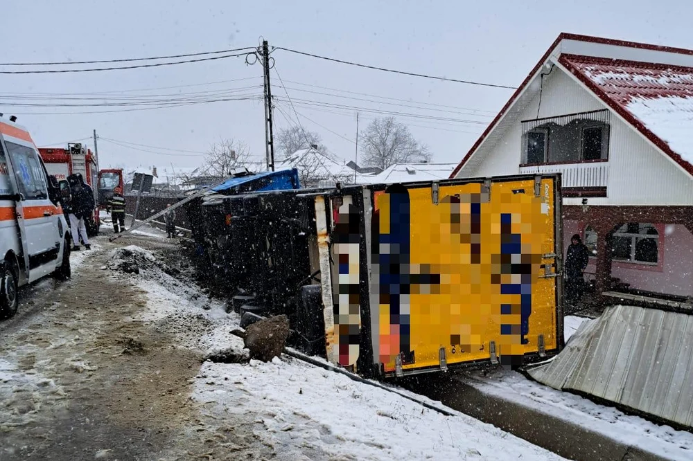 Un șofer de TIR și pasagera lui au văzut au văzut moartea cu ochii după ce camionul în care se aflau s-a răsturnat în curtea unei case.