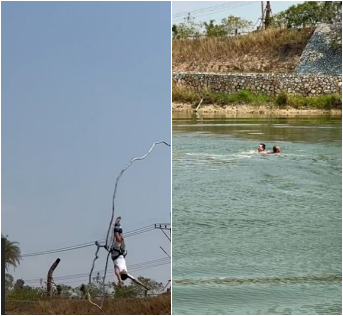 1 din 3 | Momente de panică pentru un turist din Hong Kong după ce i s-a rupt coarda elastică în timpul unei cascadorii deapsupra unui lac din Thailanda