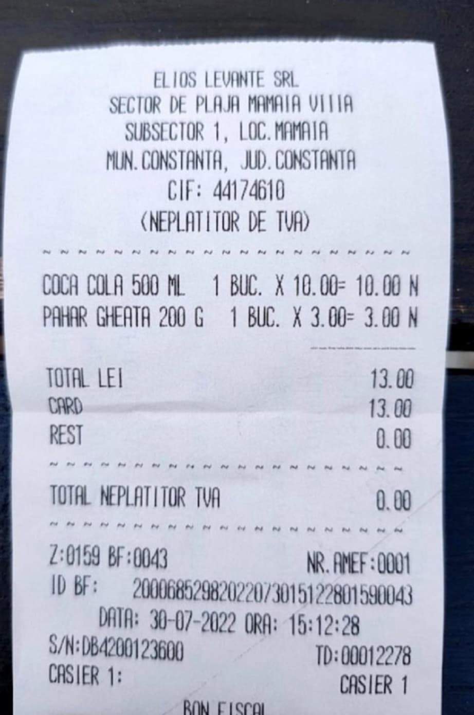 Un român a ales să-și petreacă concediul în stațiunea Mamaia, însă prețurile l-au luat prin surprindere. El a postat chiar și o fotografie cu un bon fiscal care arată cât a plătit pe o băutură cu gheață. Ospătarii i-au cerut bani în plus pentru câteva cuburi de gheață.