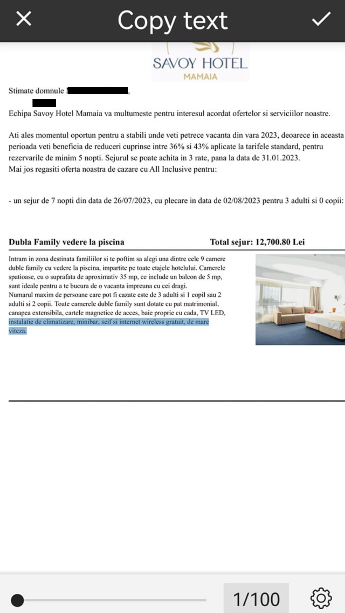 „Stimate domnule..., Echipa... vă mulțumește pentru interesul acordat ofertelor și serviciilor noastre. Ați ales momentul oportun pentru a stabili unde veți petrece vacanța din vara 2023, deoarece în această perioadă veți beneficia de reduceri cuprinse între 36% și 43% aplicate la tarifele standard pentru rezervările de minim 5 nopți.