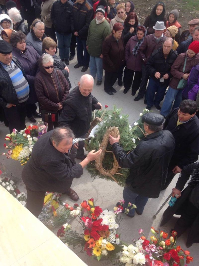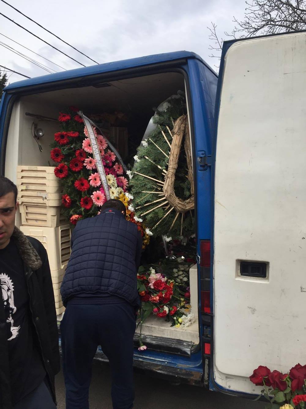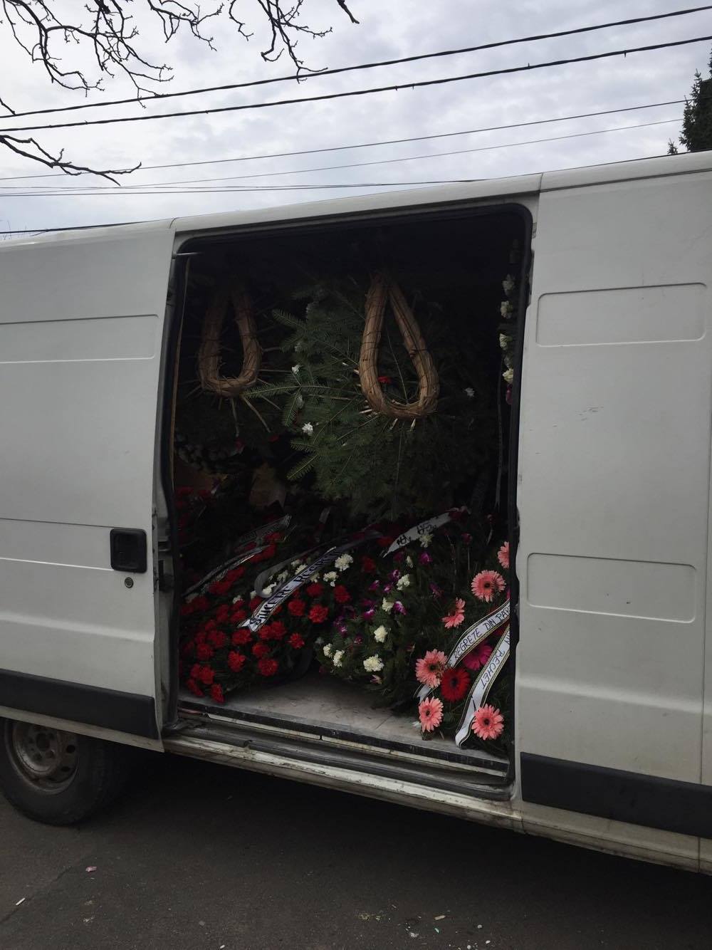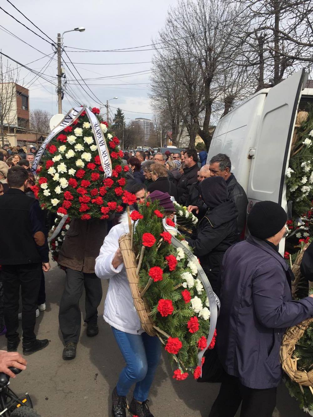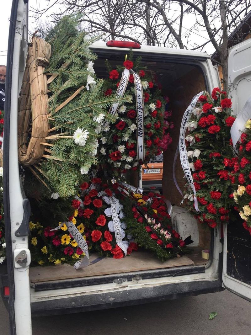Florile si coroanele au fost incarcate de la biserica in doua dube mari si transportate spre cimitir. Pentru ca nu au incaput, multe persoane care au alcatuit cortegiul s-au oferit personal sa ajute la transport.