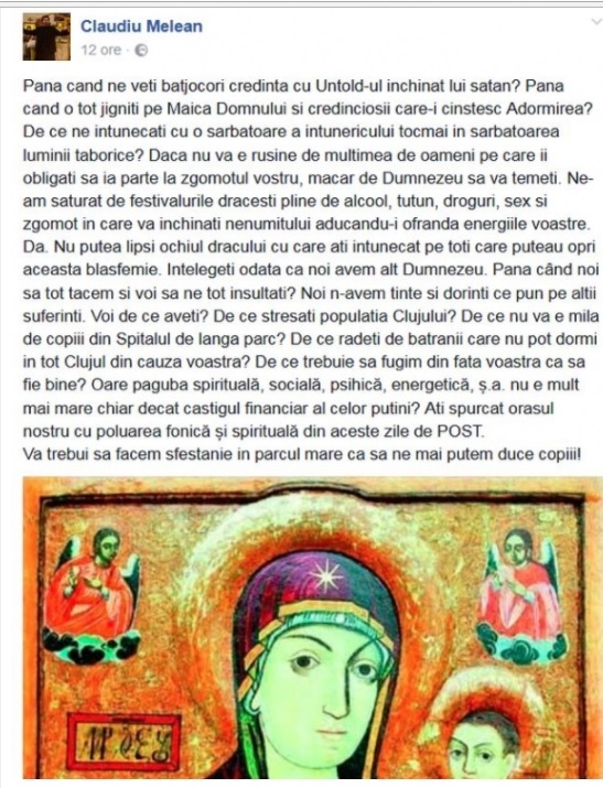 "Pana cand ne veti batjocori credinta cu Untold-ul inchinat lui satan? Pana cand o tot jigniti pe Maica Domnului si credinciosii care-i cinstesc Adormirea? De ce ne intunecati cu o sarbatoare a intunericului tocmai in sarbatoarea luminii taborice? Daca nu va e rusine de multimea de oameni pe care ii obligati sa ia parte la zgomotul vostru, macar de Dumnezeu sa va temeti.