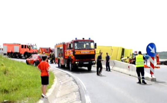 Accidentul s-a produs pe DN 1, în localitatea Perşani din judeţul Braşov, unde un autocar plin cu pasageri s-a răsturnat.
