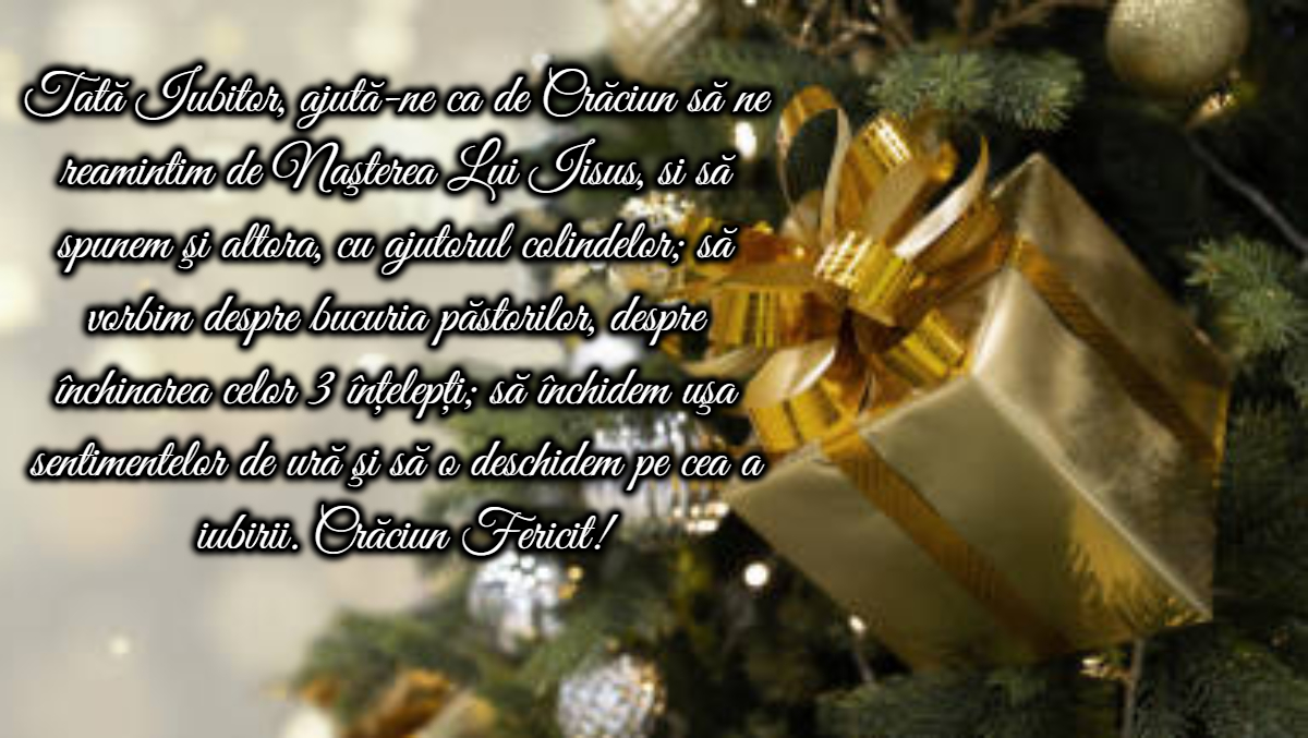 Tată Iubitor, ajută-ne ca de Crăciun să ne reamintim de Naşterea Lui Iisus, si să spunem şi altora, cu ajutorul colindelor; să vorbim despre bucuria păstorilor, despre închinarea celor 3 înţelepţi; să închidem uşa sentimentelor de ură şi să o deschidem pe cea a iubirii.