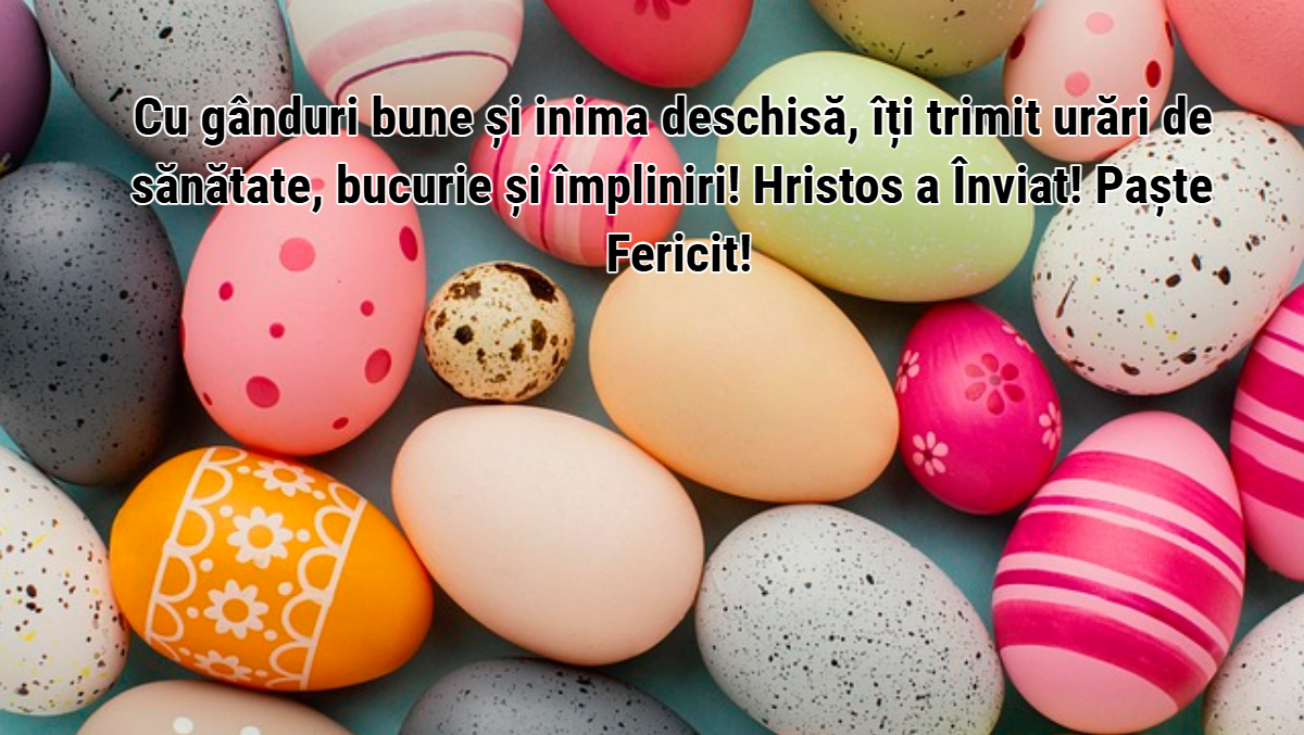 Cu gânduri bune și inima deschisă, îți trimit urări de sănătate, bucurie și împliniri! Hristos a Înviat! Paște Fericit!
