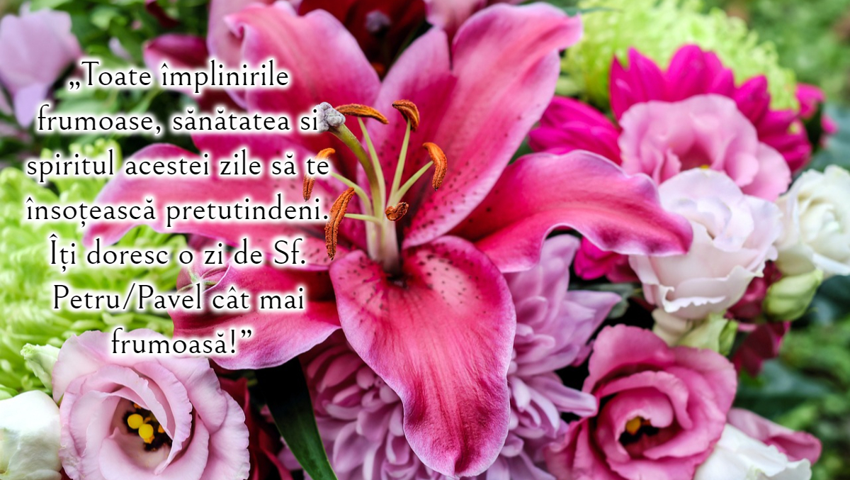 „Fie ca toate împlinirile frumoase, sănătatea și spiritul acestei zile sa te însoțească pretutindeni. Îți doresc o zi de Sf. Petru/Pavel cât mai frumoasă! ”