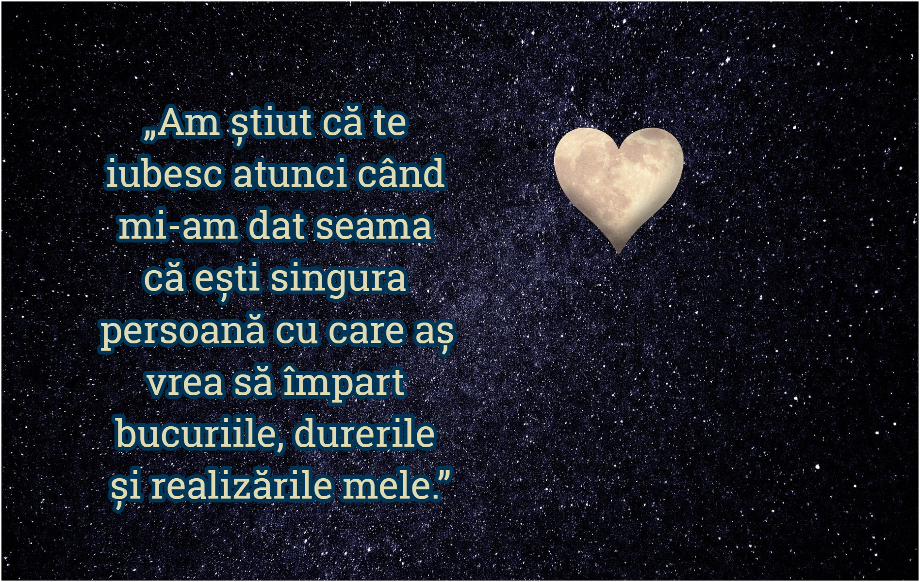„Am știut că te iubesc atunci când mi-am dat seama că ești singura persoană cu care aș vrea să împart bucuriile, durerile și realizările mele.”