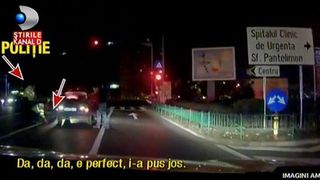 "Ia, uitati, au coborat din masina. Pai, la semafor. E la semafor. Uitati, vad o masina de politie care vine. Traverseaza. Vine de pe Fundeni."
