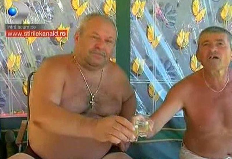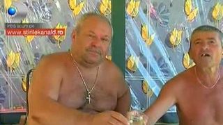 Vai de mine, am ajuns la noroc. Cameramanul bea? Aoleu, e sofer. N-are voie! Pai si mata nu conduci? Nu. Imping eu masina, daca e. Sanatate! Noroc!