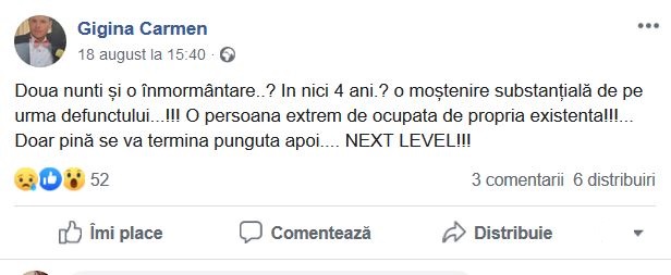 ”Două nunți și o înmormântare...? În nici 4 ani? O moștenire substanțială de pe urma defunctului...!!! O persoană extrem de ocupată de propria existență!!! Doar până se va termina punguța apoi... next level”, a scris mama lui Gigină pe contul ei de socializare.