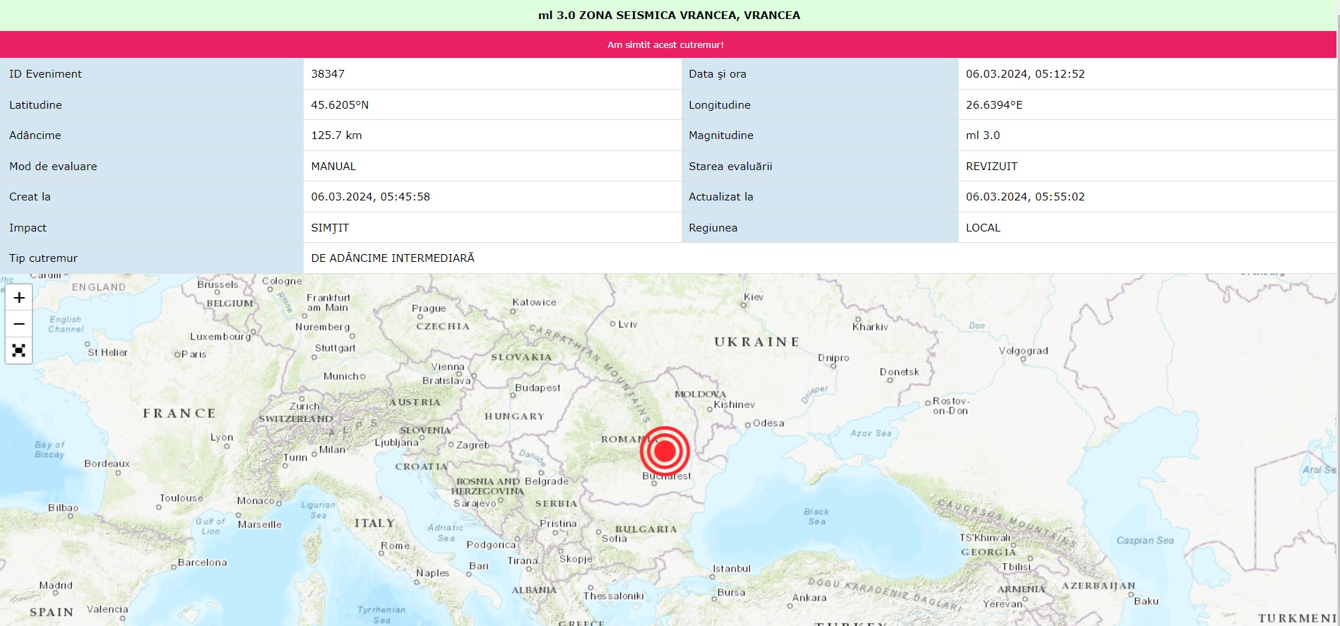 Un cutremur a avut loc în ziua de 04 martie 2024 la ora 03:47:51 (ora locală a României) în ZONA SEISMICA VRANCEA, BUZAU.