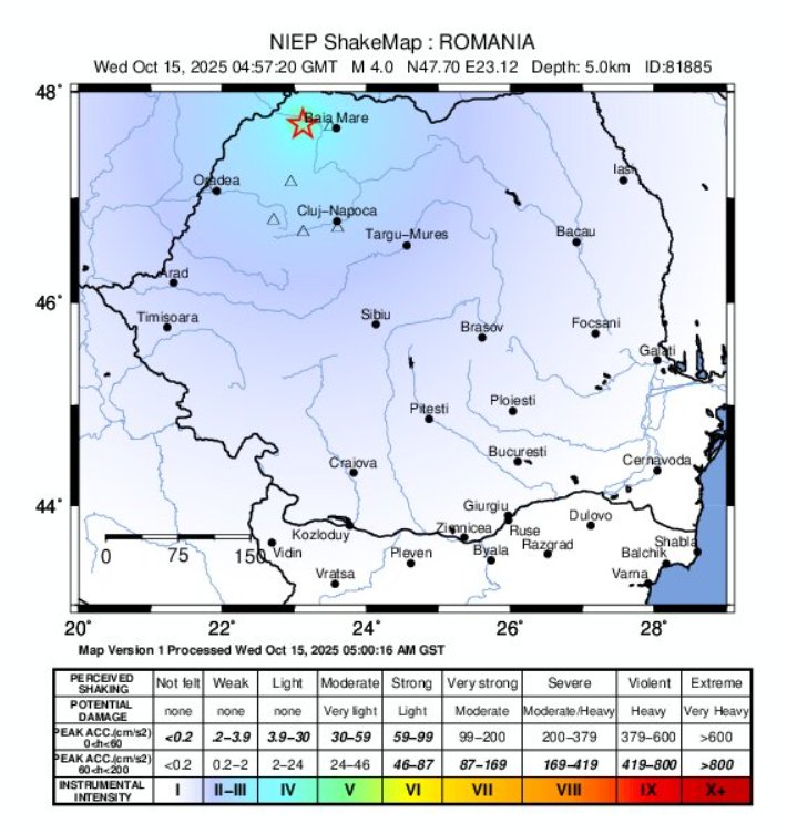 România a fost zguduită miercuri dimineață de două cutremure succesive, potrivit datelor transmise de INCDFP. Primul seism s-a produs la ora 07:57, în regiunea Maramureș, Satu Mare, și a întregistrat o magnitudine de 4,0 pe scara Richter. Cutremurul a fost de suprafață, înregistrat la o adâncime de numai 5 kilometri, și a avut o intensitate epicentrală de gradul V pe scara Mercalli, fiind resimțit clar în mai multe localități din nord-vestul țării. Epicentrul a fost localizat în apropierea orașelor Satu Mare (22 km sud-est), Baia Mare (34 km vest), Zalău (55 km nord) și Mukacheve, Ucraina (87 km sud). O altă înregistrare a institutului arată că, la aceeași oră (07:57:19), s-a produs un seism de magnitudine 4,0 ml, la o adâncime de 4,1 kilometri, în aceeași zonă Maramureș, Satu Mare.