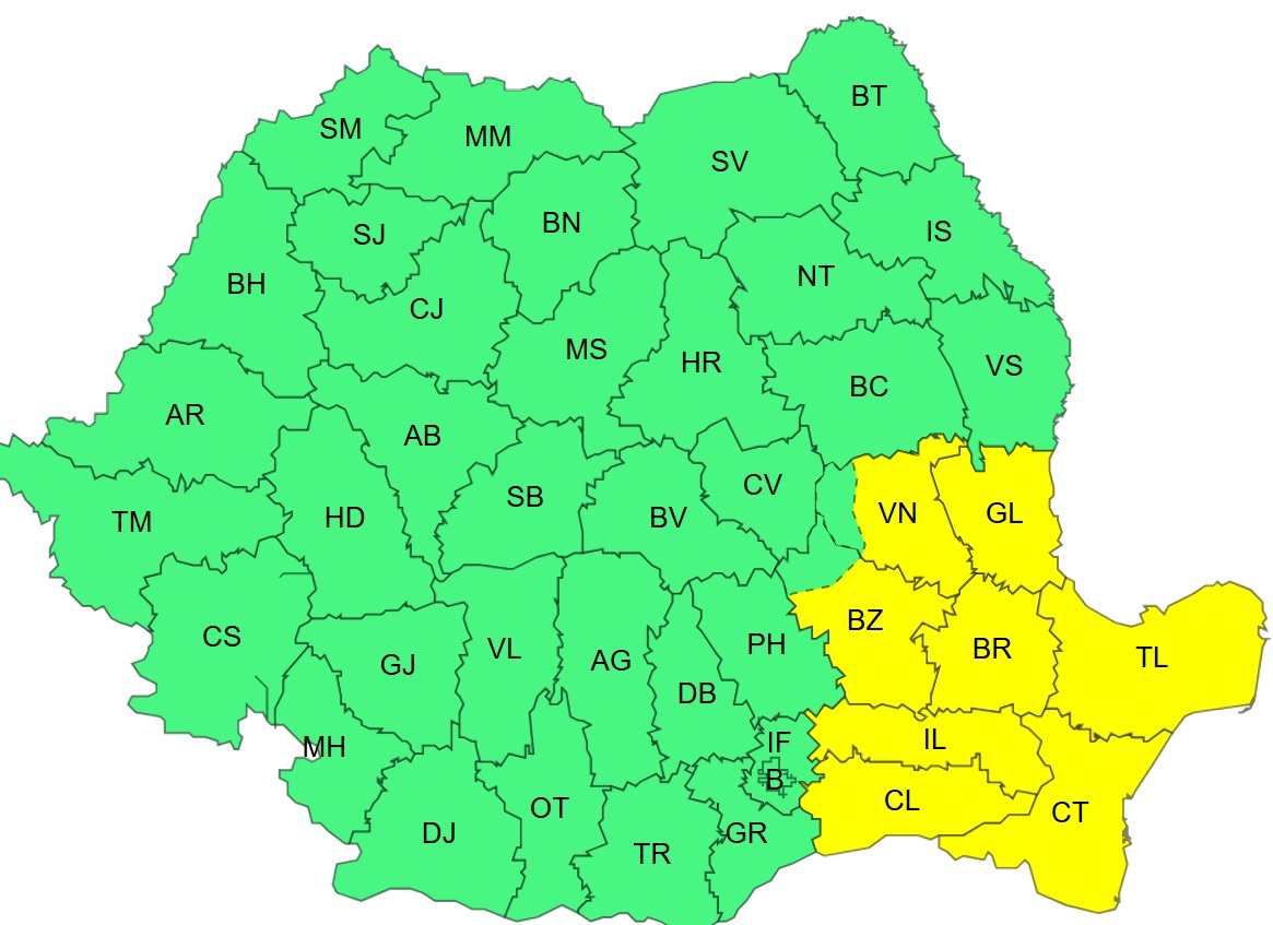 Zone afectate: județele Tulcea și Constanța, jumătatea estică a județelor Ialomița și Călărași