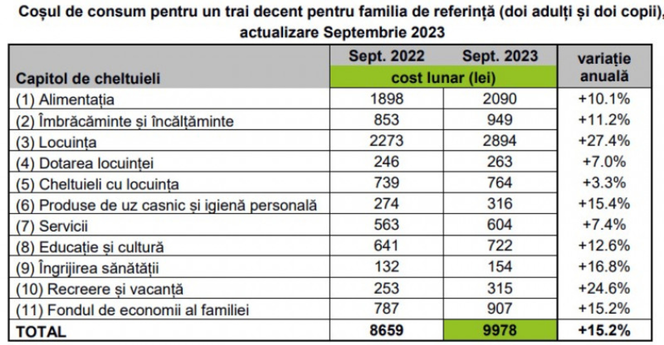 Potrivit raportului, coșul minim de consum pentru ca o familie formată din doi adulți și doi copii să trăiască decent este de 9.978 de lei lunar. Costul total al coșului minim pentru o familie era diferit în luna septembrie a anului 2022, când acesta valora 8.659 de lei pe lună, înregistrându-se o creștere de 15,2%.