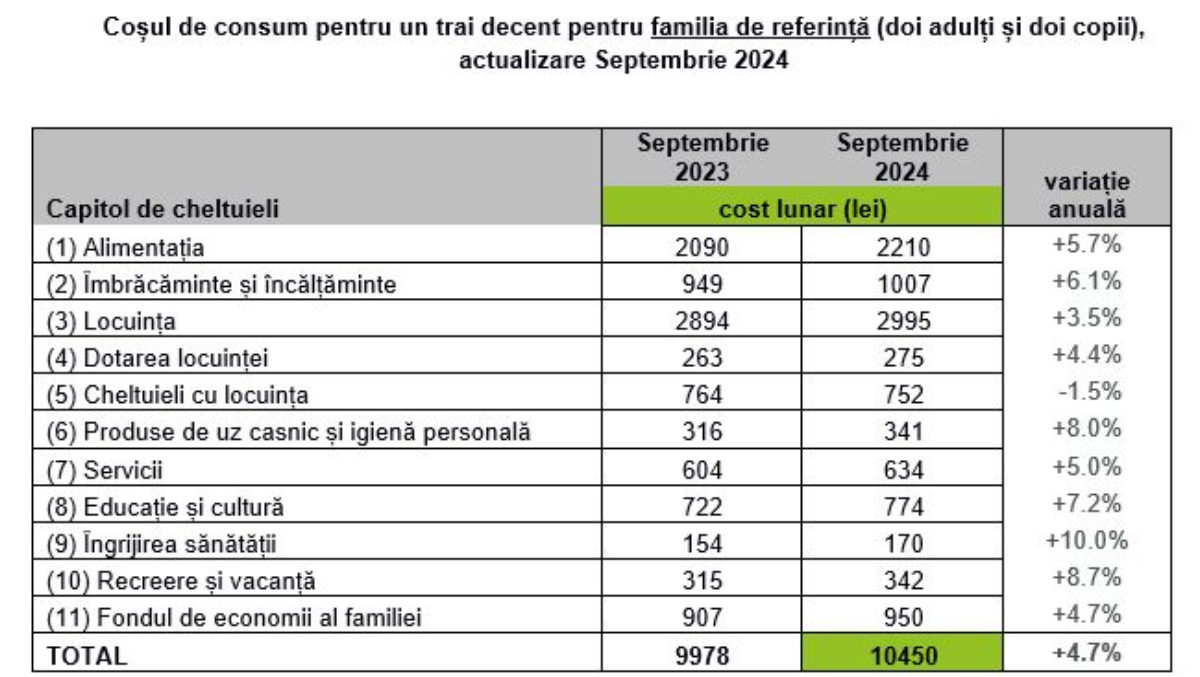 Realizatorii studiului au precizat că recalcularea valorii coşului s-a realizat în baza indicilor de preţuri comunicaţi de Institutul Naţional de Statistică pentru luna septembrie 2024 raportat la luna septembrie 2023.