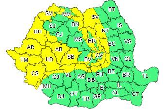 ANM transmite un cod galben de nisnori și vânt puternic, la munte. Cod galben de vijelii, ploi şi descărcări electrice în Banat, Crişana şi local în Transilvania şi Maramureş.
