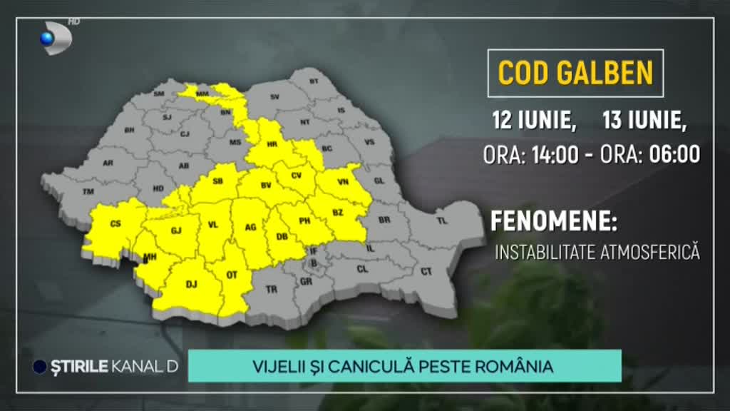 „Fenomenele extreme continuă și astăzi. Meteorologii anunță că, începând de la ora 14, mai multe județe din țară vor fi sub avertizare de cod galben de instabilitate atmosferică până mâine dimineață. În aceste zone sunt așteptate vijelii, căderi de grindină și descărcări electrice. Ploile vor aduce cantități de apă în intervale scurte de timp de 20-30 litri pe metru pătrat și, izolat, 40 de litri pe metru pătrat. În același timp, în Muntenia, sudul Olteniei și o parte a Dobrogei se află astăzi și mâine sub cod galben de caniculă și disconfort termic accentuat. Sunt așteptate maxime de peste 34 de grade, iar indicele de temperatură-umezeală va atinge 80 de unități”, a spus Cristina Dorobanțu.