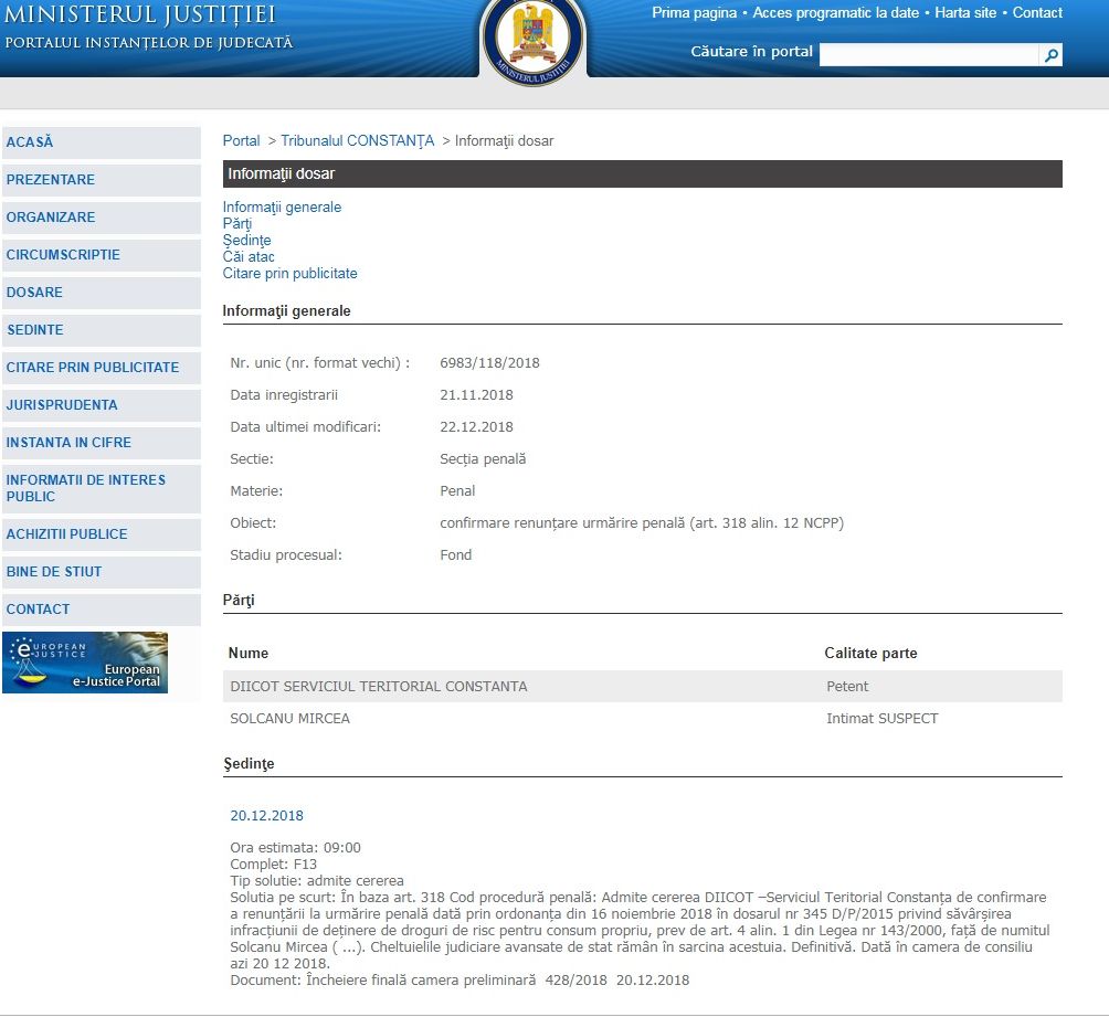 Astfel, magistrații au admis atunci cererea DIICOT- Serviciul Teritorial Constanța, de confirmarea a renunțării la urmărirea penală privind săvârșirea infracțiunii de deținere de droguri de risc pentru consum propriu față de numitul Solcanu Mircea.