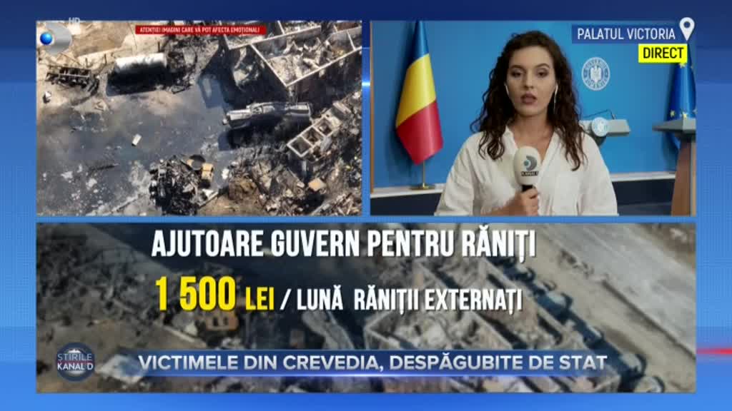 „Guvernul adoptă în ședința de astăzi o hotărâre de Guvern care vizează acordarea unor ajutoare celor afectați de explozia din Crevedia. Vorbim aici despre 2.000 de euro pe lună pe celor care au pacienții internați în străinătate. De asemenea, 2.000 de lei pe lună aparținătorilor care au rude sau prieteni în spitalele din țara noastră și Guvernul va mai acorda 1.500 de lei celor care au fost internați în spitale și apoi externați.