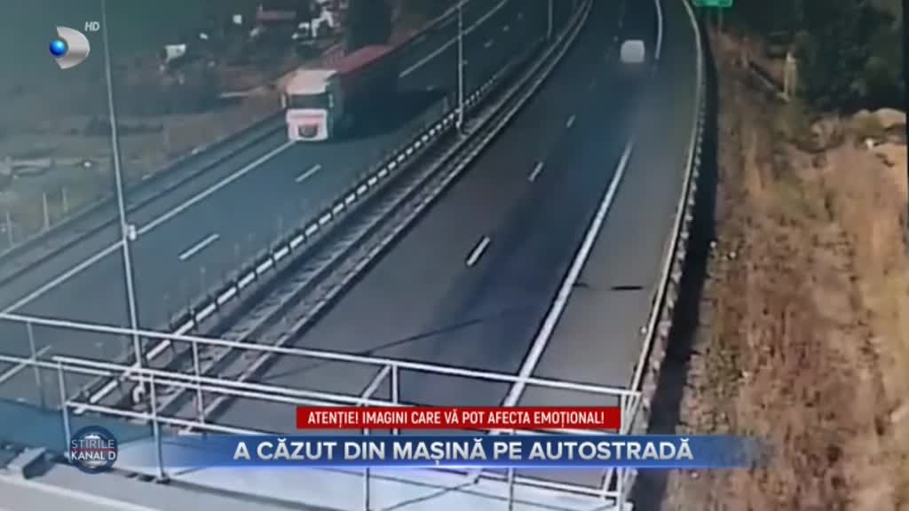 Camerele de supraveghere au suprins momentul în care bărbatul cade din mașina care circula cu viteză, pe prima bandă. Autoturismul condus de concubina sa, o femeia din Bulgaria, a oprit la câteva sute de metri distanță.