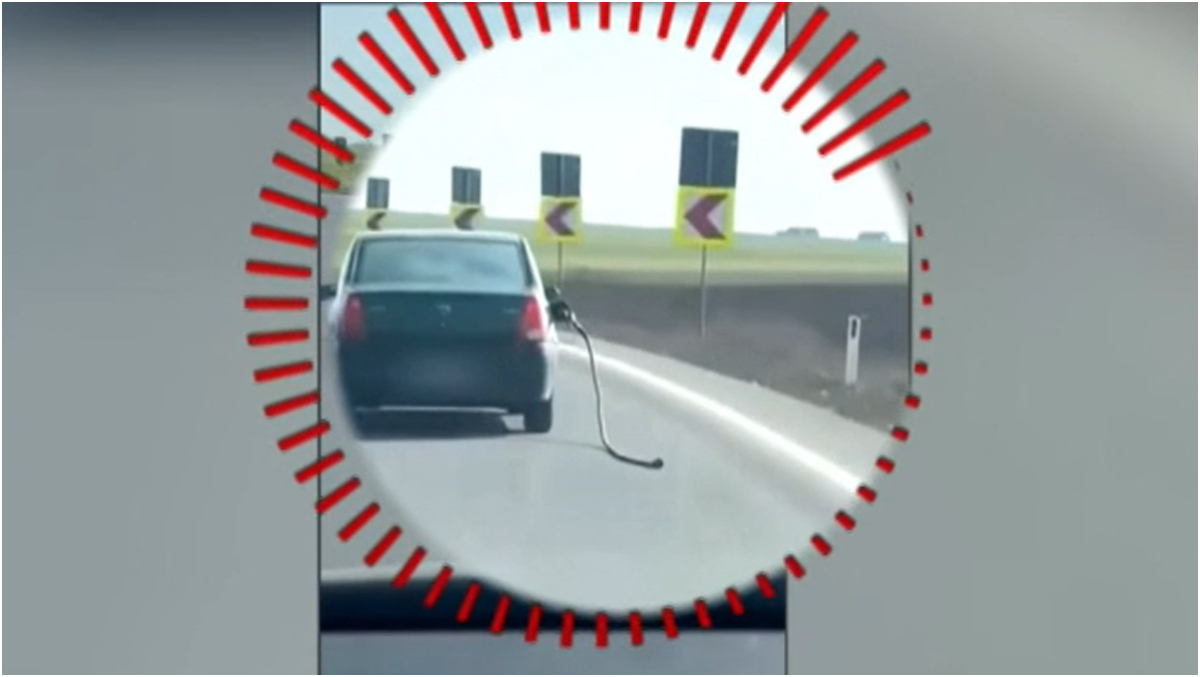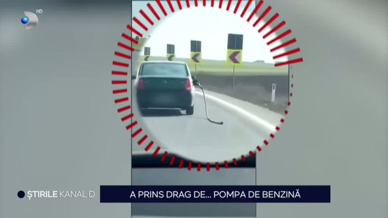 Așa cum se vede în imagini bărbatul care conducea o mașină cu numere de Botoșani a plecat cu tot cu furtunul de la pompa de alimentare și a mers așa o bună bucată din drum fără să realizeze ce se întâmplă.