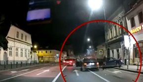 În imaginile suprinse de o cameră de bord se observă în depărtare o mașină care staționează pe avarii. Din spate vine cu viteză un alt autoturism al cărui șofer nu vede la timp mașina oprită și o izbește în plin. Vehiculul staționat a fost proiectat pe trotuar, dar a lovit și un stâlp de iluminat.