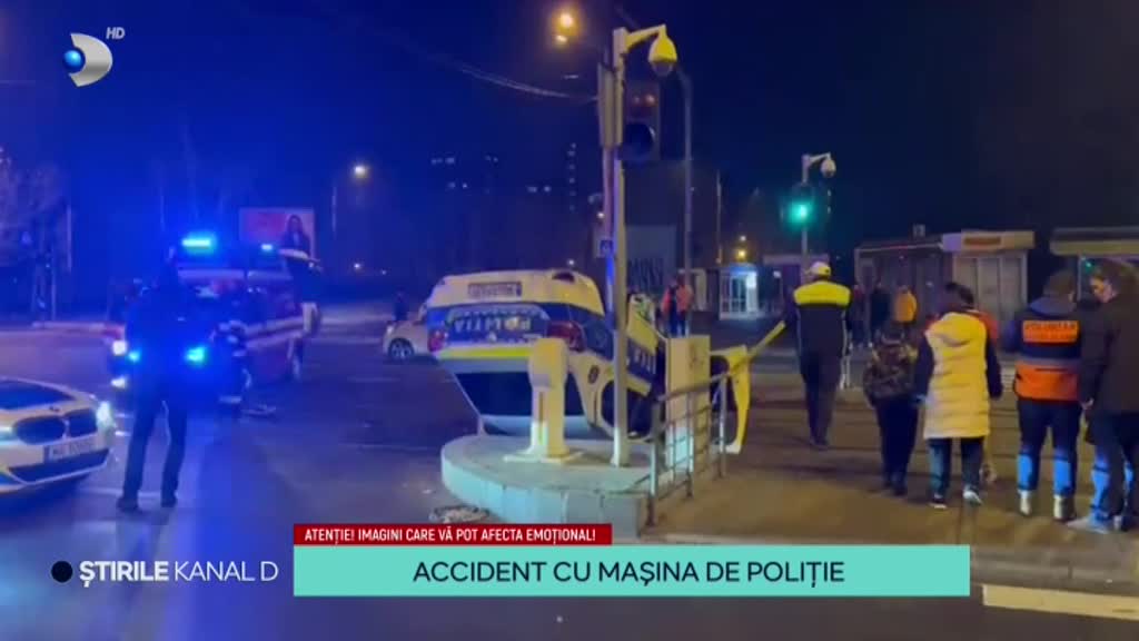 „O mașină de poliție s-a răsturnat după ce a fost implicată, aseară, într-un accident în București. Autospeciala se află în misiune cu semnalele optice și acustice în funcțiune, când a fost implicată în accident cu un alt autoturism într-o intersecție din oraș. În urma impactului, o polițistă aflată în mașina de poliție, pe locul din dreapta față, a fost transportată la spital. De asemenea, ambii conducători auto au fost testați cu aparatul alcooltest, rezultatele indicate fiind zero. În continuare se efectuează cercetări pentru a se stabili cu exactitate cum s-a produs accidetul de circulație”, a spus Cristina Dorobanțu.