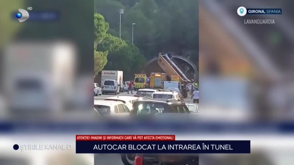 „În Spania un autocar plin cu pasageri s-a răsturnat la intrarea într-un tunel. Imaginile transmise de la fața locului sunt dramatice. Vehiculul a ajuns pe verticală și s-a proptit de tunel, blocând complet circulația. Potrivit presei locale, accidentul s-a petrecut în zona Girona. În autocar se aflau șaizeci de muncitori de la o companie textilă, care mergeau spre muncă, trei oameni au fost răniți. Chiar înainte ca șoferul să piardă controlul volanului, călătorii au auzit o explozie, probabil cea a unui pneu, este ipoteza poliției.