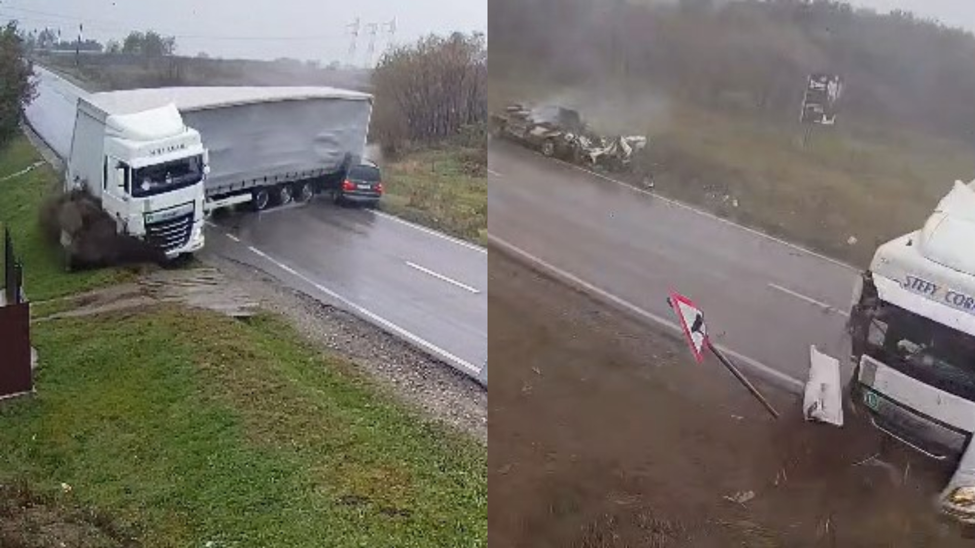 Pe filmare se observă cum șoferul camionului pierde brusc controlul direcției, vehiculul derapează și se înclină violent, blocând complet carosabilul. Autoturismul care venea din sens opus nu a mai avut nicio șansă să evite coliziunea. Într-o secundă, camionul s-a prăbușit peste mașină, strivind-o complet.