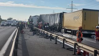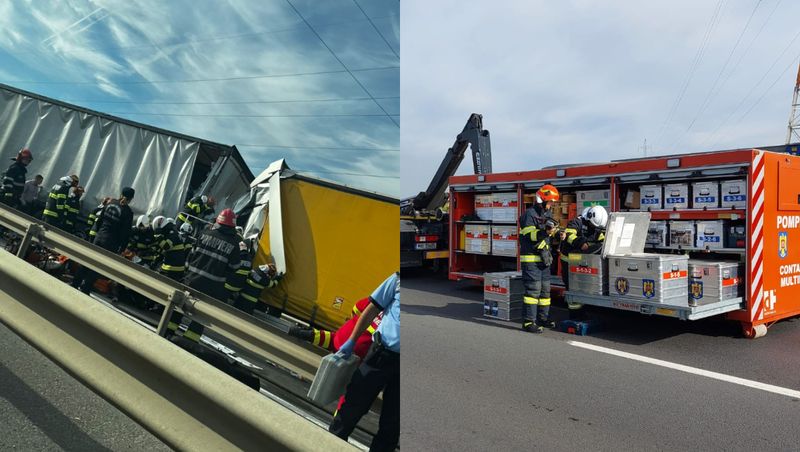 1 din 4 | VIDEO - Accident mortal pe Autostrada A1/ Patru vehicule implicate/ Un autoturism a fost prins între două TIR-uri