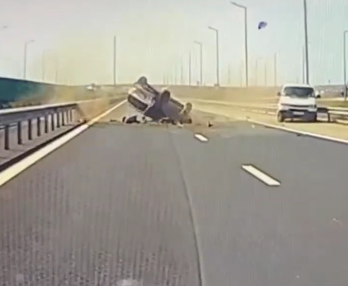 Din imaginile surprinse de camera de bord a altui participant la trafic, se vede cum autoturismul din spate îl lovește violent pe cel din față, apoi se răstoarnă pe șosea.