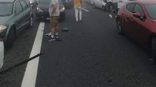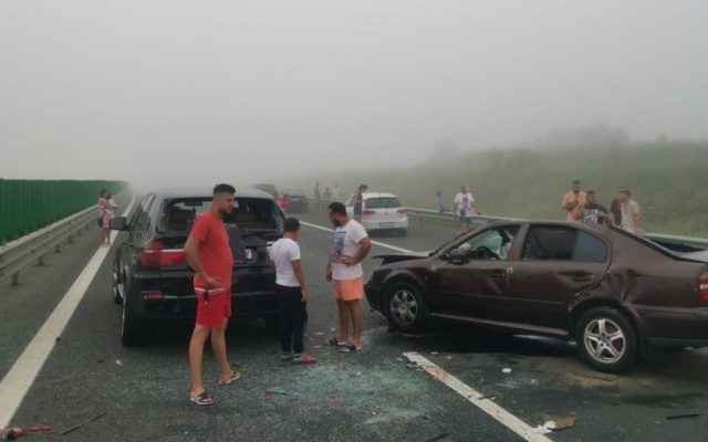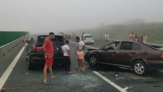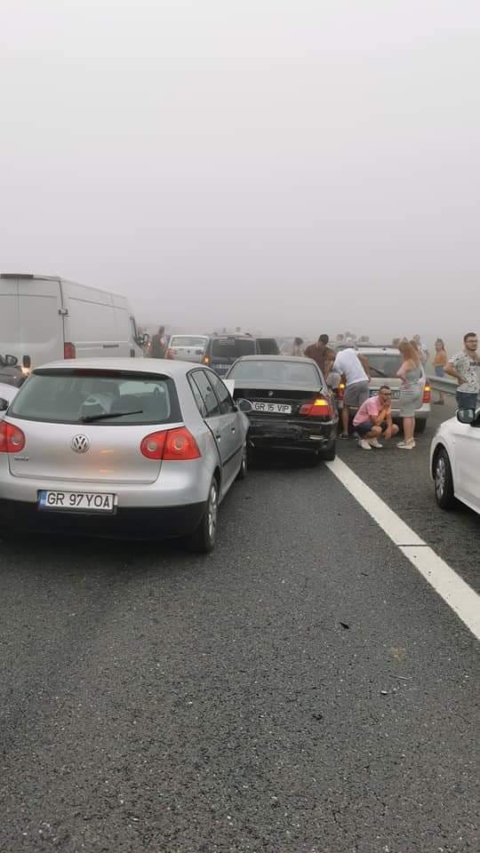 2 din 5 | Din primele informații în carambol sunt implicate în jur de 20 de autoturisme, iar două persoane au fost rănite, dintre care una este încarcerată. Pe autostradă era ceață la ora producerii accidentului