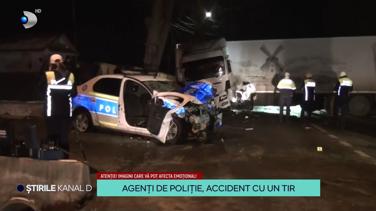 „Doi polițiști și șoferul unui TIR au ajuns la spital după ce mașina de poliție s-a ciocnit frontal cu camionul.