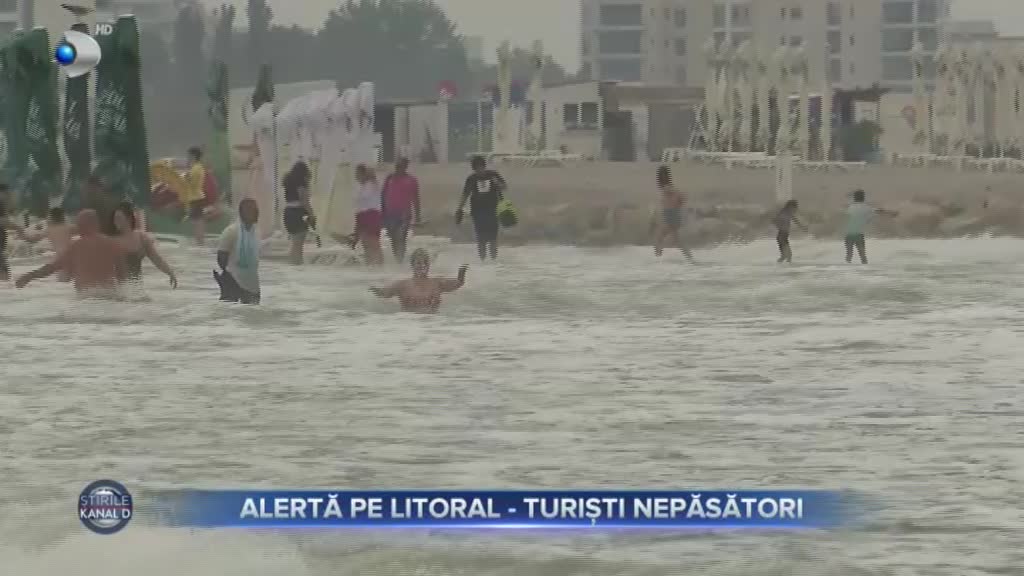 Pe lângă steagul roșu arborat încă de ieri, pe litoral a fost cod galben de vânt. Rafalele au atins chiar și 70 km/oră. Turiștii ignoră însă indicațiile salvamarilor și continuă să intre în apă.
