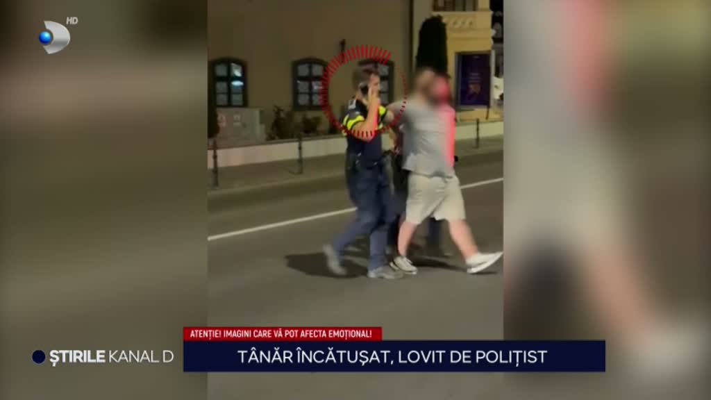 Imaginile surprinse de martori arată cum agentul aplică mai multe lovituri cu piciorul în burtă tânărului, chiar și în momentul în care acesta este deja reținut și se află lângă autospecială.