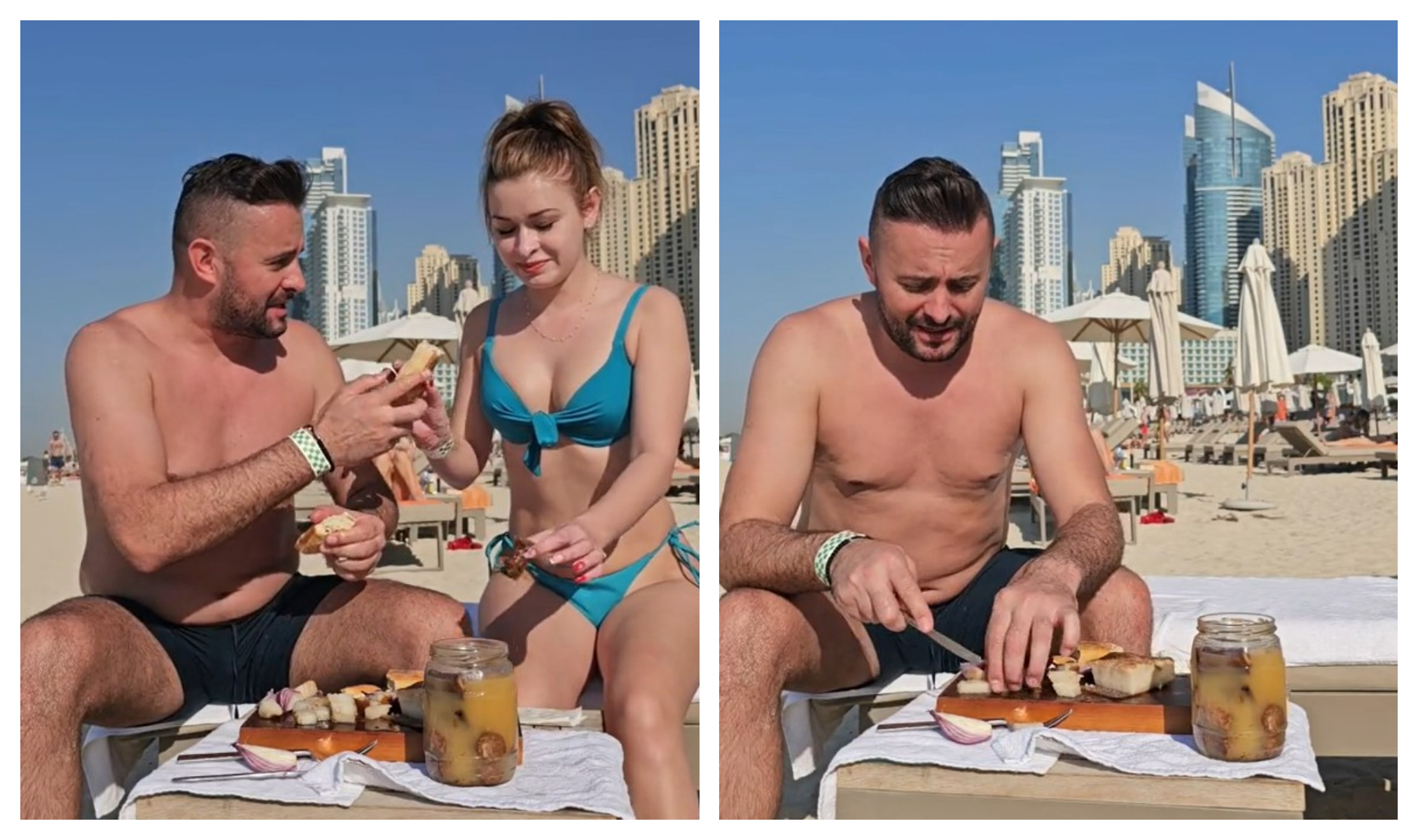 Un videoclip cu doi români în timp ce mâncau ceapă cu slănină pe o plajă din Dubai a devenit viral pe TikTok. Reacțiile internauților nu au întârziat să apară.