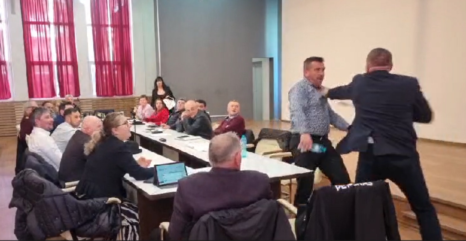 În imaginile de mai jos, se văd disputele din sala de ședințe, cu injurii și împingeri. Unul dintre participanți aruncă cu apă spre celălalt și sunt la un pas de bătaie.