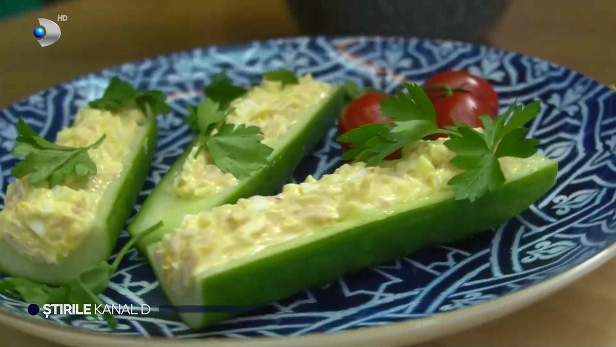 La rubrica de gătit vă este prezentat un antreu sau o gustare ușoară: bărcuțe de castravete umplute cu o salată de ton și ouă, fără maioneză, dar cu iaurt grecesc și muștar.