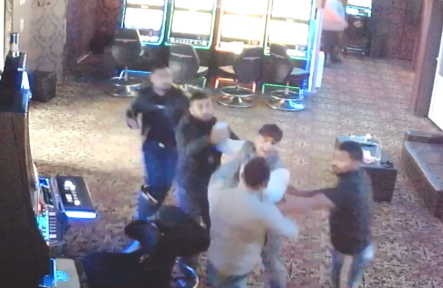 Nimic nu pare sa prevesteasca bataia crunta care va incepe in doar cateva secunde. Totul a inceput in momentul in care un barbat a intrat in local si s-a indreptat catre masa la care stau alti patru clienti. Unul dintre ei se indeparteaza la timp. Alti doi barbati intra in sala de jocuri si se duc in fuga catre aceeasi masa.