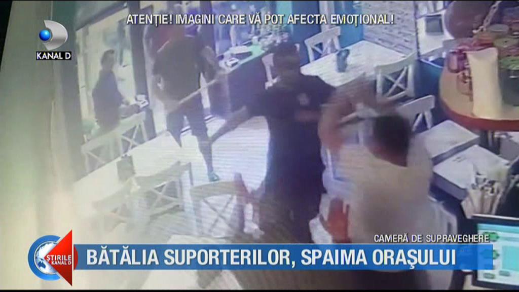 Camerele de supraveghere ale barului au surprins momentul in care 15 persoane se ridica de la mese si incep sa se fugareasca. Unii dintre ei isi impart pumni, altii arunca sticle. Bataia continua si in interiorul localului, unde doi suporteri ii impart bate, pumni si picioare unui fan al echipei adverse; totul sub privirile inspaimantate ale trecatorilor si ale patronilor.