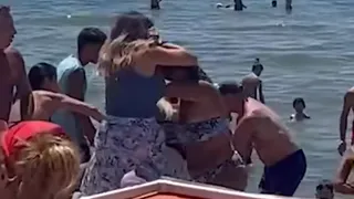 Cele două turiste sunt filmate în timp ce se lovesc și se apucă de păr pe nisip, în timp ce restul turiștilor încearcă să aplaneze conflictul.