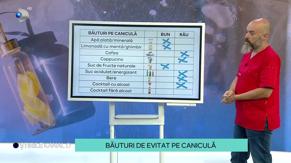 „Mai avem de îndurat săptămâni întregi de caniculă, iar combinația de alimente și băuturi pe care o facem nu e întotdeauna potrivită. Ba dimpotrivă, ce consumăm în vacanță sau acasă ne poate duce la deshidratare și chiar toxiinfecție alimentară. Cum combinăm produsele astfel încât să fie și gustoase și sănătoase, aflăm astăzi de la medicul de familie, Răzvan Vintilescu”, a spus Simona Pătruleasa.