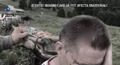 Parca turbati, ciobanii il lovesc fara mila pe cetateanul belgian: doi il tin, altul il altoieste cu o bata. In toiul atacului, victima in costum de motociclist isi pierde casca, iar agresorul profita de moment ca sa-l loveasca in cap.