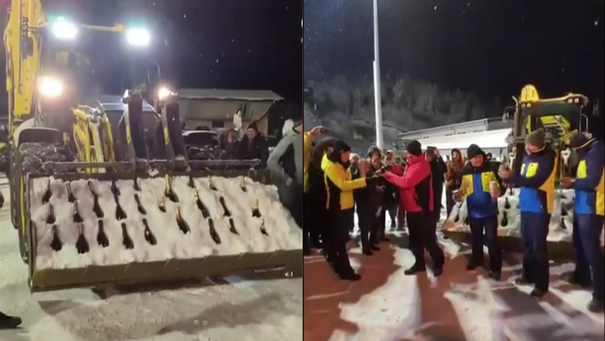 Buldoexcavatorul plin cu sticle de șampanie a fost adus la o petrecere dată în cinstea primului weekend de schi nocturn.