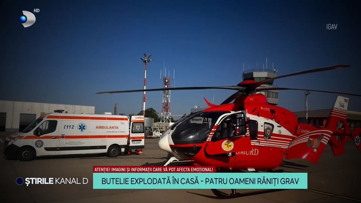 Patru persoane, printre care o fată de 14 ani, au fost transportate de urgență la spital în urma exploziei unei butelii urmată de un incendiu în comuna Letea Vechie, județul Bacău. Incidentul s-a produs în momentul în care una dintre victime încerca să conecteze butelia la aragaz, iar aceasta a explodat, cuprinzându-i pe cei aflați în casă în flăcări.